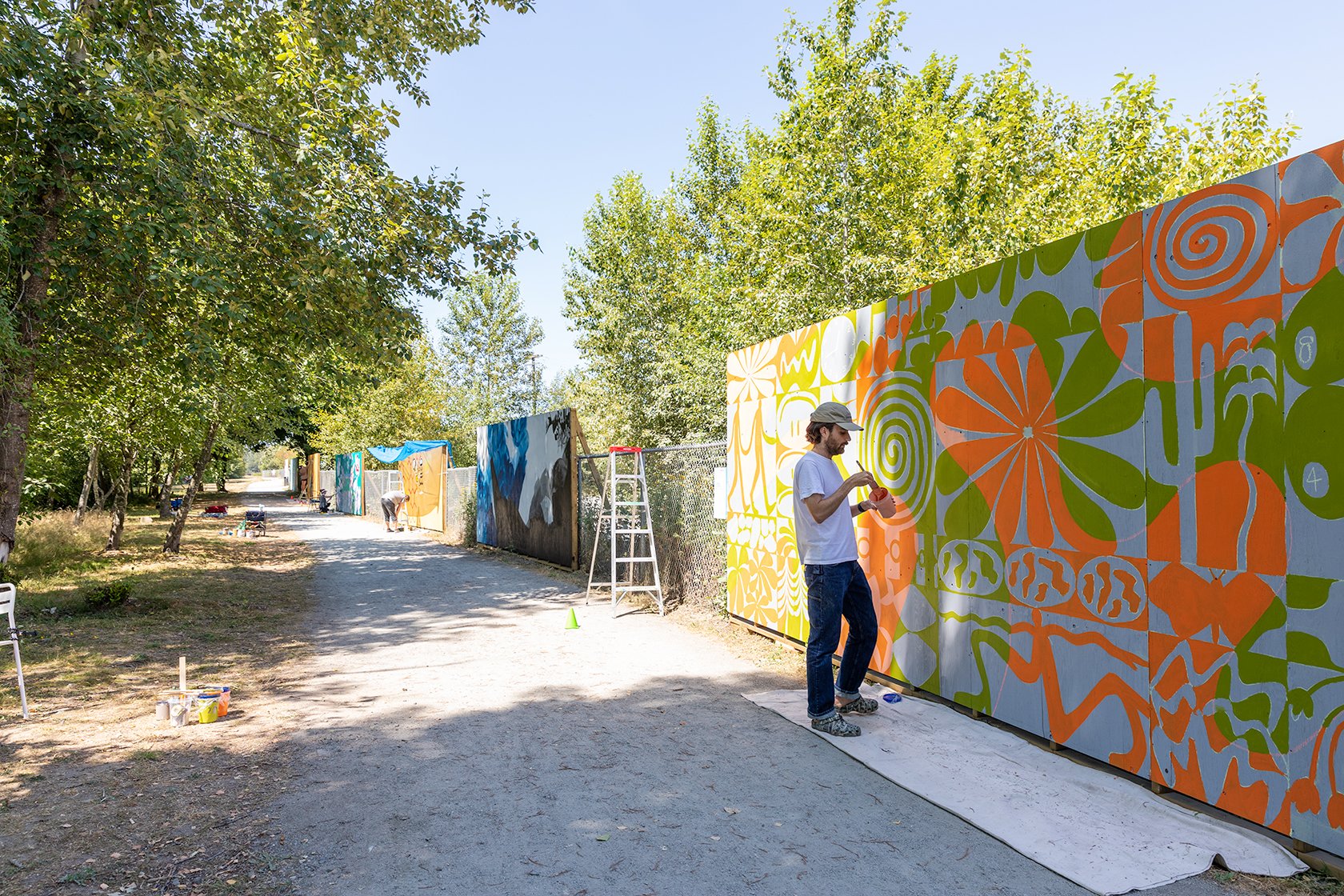 For the 2023 edition of Murals Without Walls, Guest Curator, Christophe Devos, has selected three established artists, Hannah Watkins, Zahra Hosseini, and Tuyết Ánh Judith Nguyễn, to create two works of art each at Main Street and 7th Ave. The six 100 sq ft artworks will be installed for 3 months and will be in place to be part of Make Good Party on August 5th and 6th during the opening weekend of the festival.