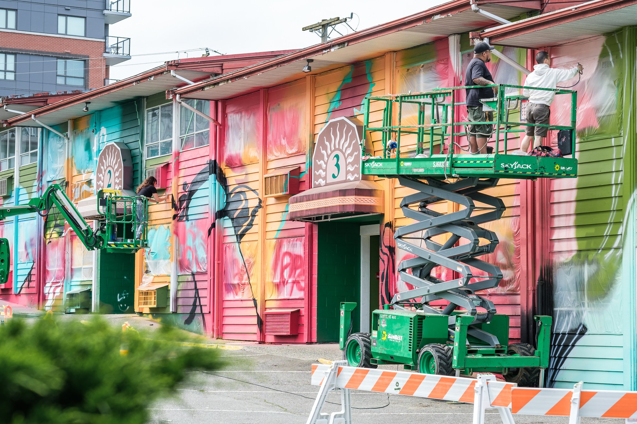 Bringing together vastly divergent styles and backgrounds, Fiona Ackerman, K.C. Hall, and Joon Lee have transformed the iconic City Centre Motel into a singular mural stretching across all of its surfaces. The artists’ approach has intentionally taken the spontaneity of hands-on art making to a massive scale to celebrate, amplify, and deconstruct the architecture of this Vancouver landmark — simultaneously looking at its aesthetics of a classic midcentury motor hotel, and its current use as temporary artist studios.