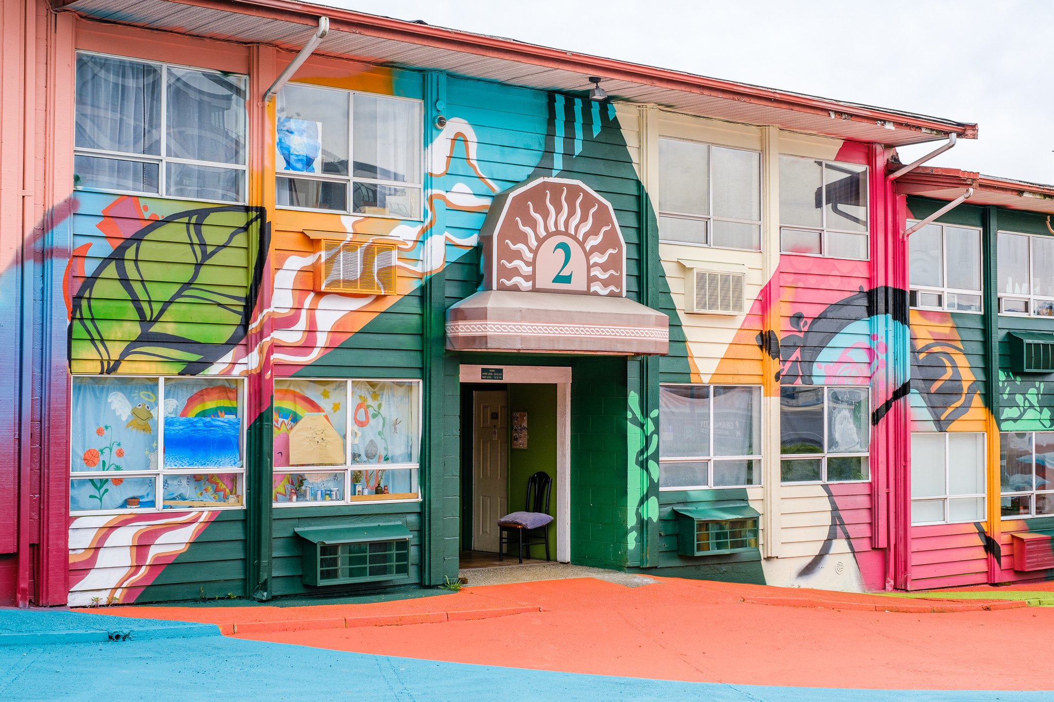 This includes converting the former motel rooms into 75 low-cost artist studios and transforming the full building exterior and parking lot with VMF’s largest mural to-date, covering over 30,000 square feet. Designed collaboratively by three local artists — Fiona Ackerman, KC Hall, and Joon Lee — the colourful, full-wrap mural, titled “Between Two Islands”, combines the 3 artists’ styles while taking inspiration from the iconic motel’s original elements.