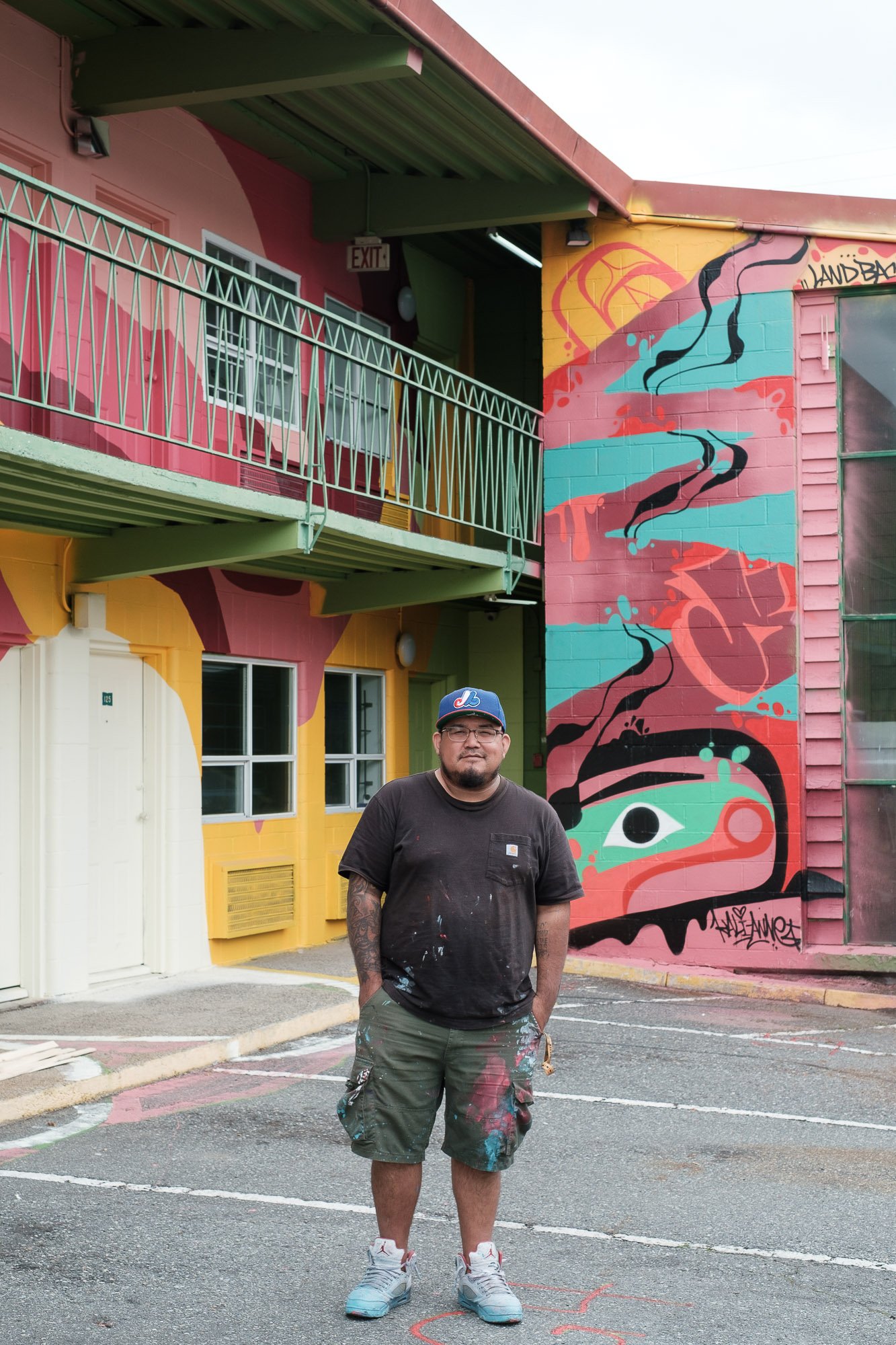 Bringing together vastly divergent styles and backgrounds, the artists have transformed the iconic City Centre Motel into a singular mural stretching across all of its surfaces. The artists’ approach has intentionally taken the spontaneity of hands-on art making to a massive scale to celebrate, amplify, and deconstruct the architecture of this Vancouver landmark — simultaneously looking at its aesthetics of a classic midcentury motor hotel, and its current use as temporary artist studios. Moving around the two buildings and the ground, each artist’s direction is brought into focus at different moments while tactically never relinquishing collaborative ownership from the whole. The mural becomes a mirror of what the City Centre Artist Lodge aspires to be: artists discovering each others’ working processes, being pushed in unexpected directions, and working alongside each other to shape this city.