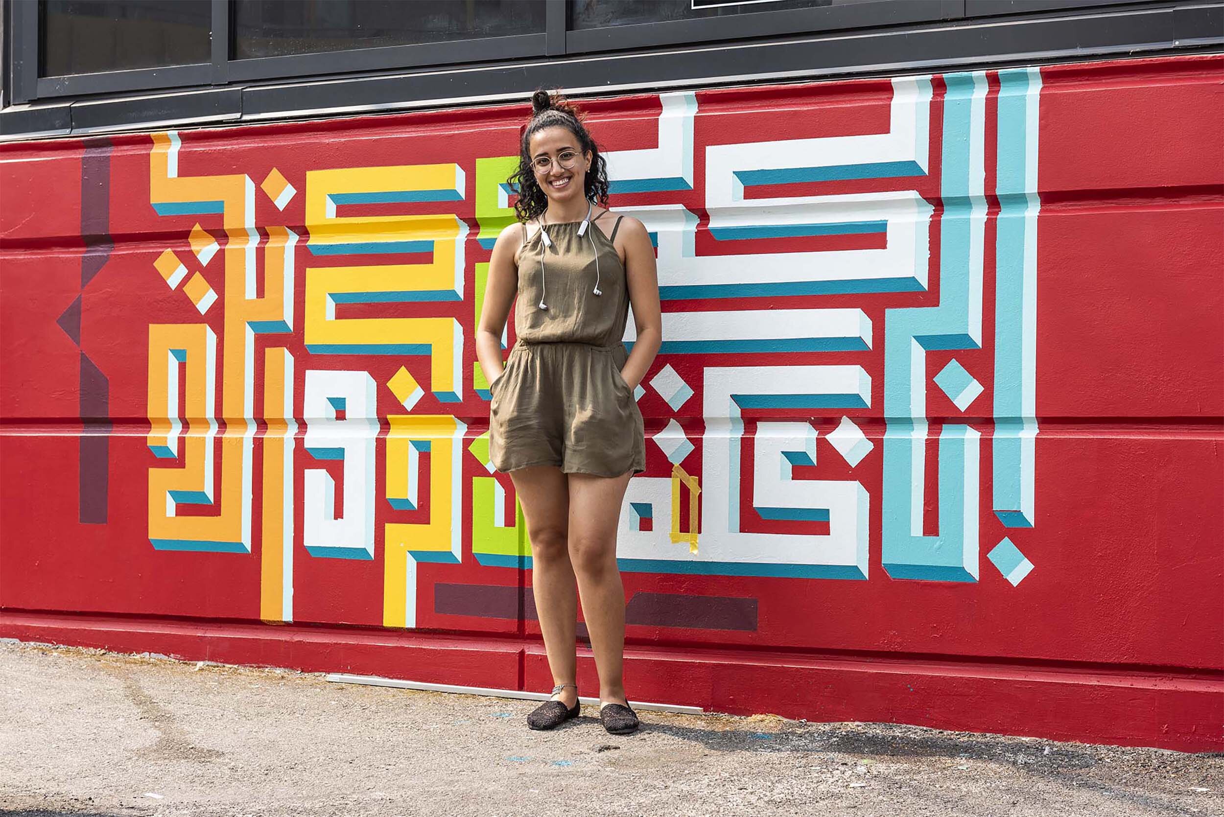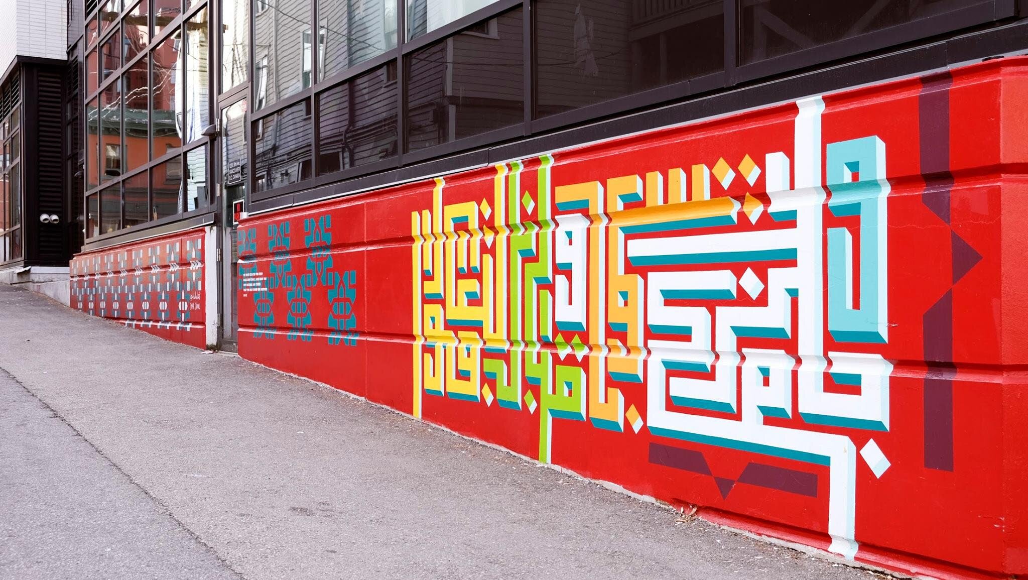 Over the next months, Aslam and CCMS selected graphic designer and photographer Doaa Jamal, to be the muralist for this project. Doaa’s professional expertise lies in creating dynamic visuals for individuals and organizations eager to understand their identity through the power of colour, shape, and symbolism. Doaa experiments with Arabic calligraphy and type; mixed media fabrication; and travel photography, all from her point of practice in Vancouver, BC. Why Can’t They See Us? is Doaa Jamal’s first mural, a 35’ wide Quran verse in multicolour Kufic calligraphy wrapping around and beneath the R-Space Art gallery in the laneway at 123 E 8th Ave, Vancouver.