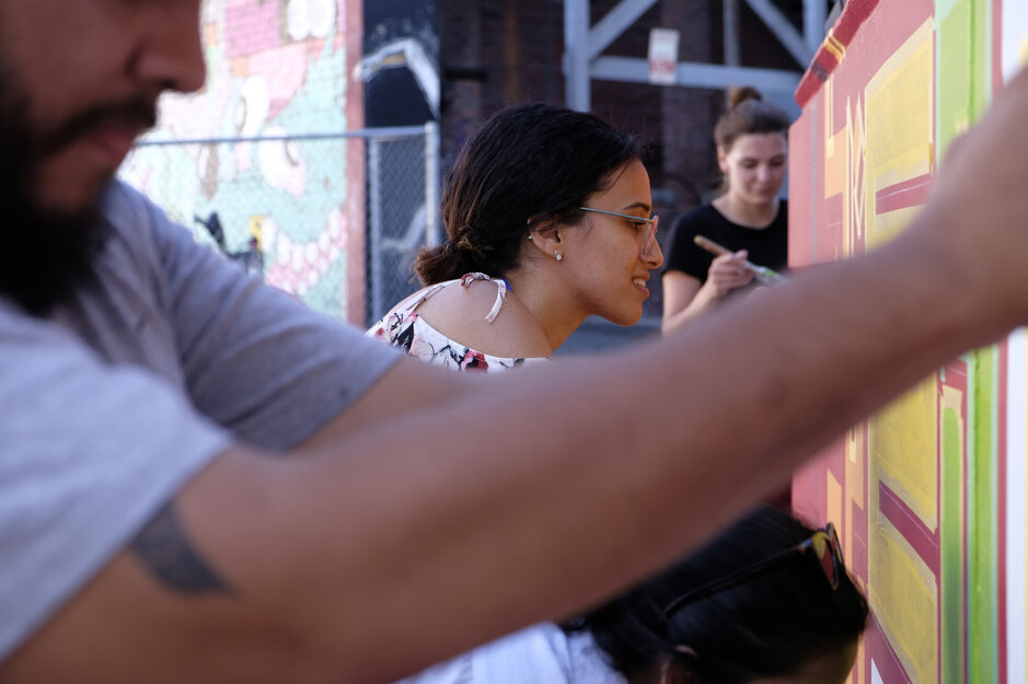 Doaa’s mural, “Why can't they see us?,” utilizes a modern version of the traditional Arabic Kufic script to convey a message of pluralism and learning from differences using a verse taken from the Quran - "We have created you from male and female, and made you into nations and tribes that you may know one another." (49:13) In the weeks leading up to the festival, the mural became a hub of community connection as friends and volunteers came to help paint the mural and bring water and food to feed Doaa and the other artists. The excitement peaked at the festival's launch and we hope the area continues to be a point of pride and a place of connection for years to come.