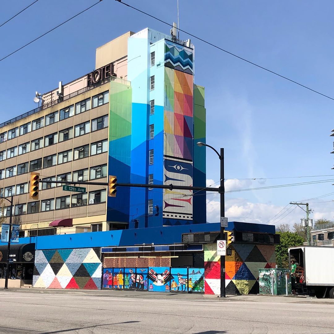This mural focuses on the powerful connection of Vancouver and it’s local indigenous nations to the spirit and animals of the ocean. It includes more than one hundred unique and vibrant colours sampled from images of both above and below the ocean surface. The mural reflects a dive deep into the ocean starting from the top with shapes of our ice-age fjords, followed by the rainbow spectrum of the shallow waters, all the way down to local sea life like the wolf eel and glass sea sponges that live in the depths of Howe Sound. All of the shapes used are inspired by local traditional weaving patterns.
