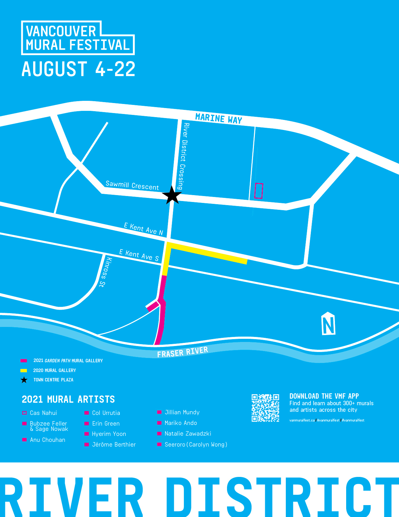 River District is a residential and commercial development, spanning 130 acres of land in South Vancouver. In 2020 it became home to ten VMF murals and 2021 brought a further eleven murals. The 2021 mural gallery, named “Garden Path”, has brought our artists together around the idea of a meandering path between a cultivated garden and wild forest, as a site of exchange, imagination, myth, transformation, and knowledge.
